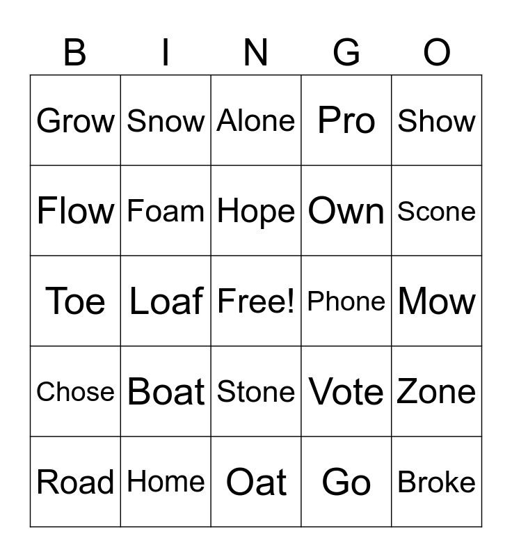 This bingo card has a free space and 24 words: Boat, Home, Hope, Road, Show, Grow, Flow, Snow, Phone, Stone, Own, Toe, Vote, Zone, Foam, Go, Mow, Alone, Scone, Loaf, Broke, Chose, Pro and Oat.