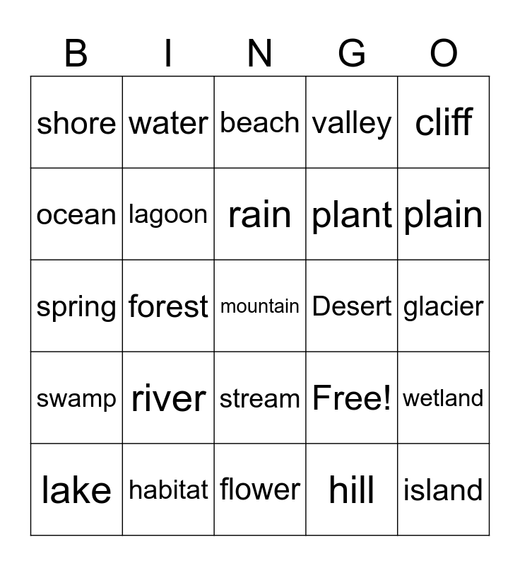 This bingo card has 25 words: river, flower, rain, lake, cliff, shore, ocean, water, Desert, stream, plant, spring, Free!, wetland, lagoon, island, glacier, beach, plain, forest, mountain, habitat, swamp, valley and hill.
