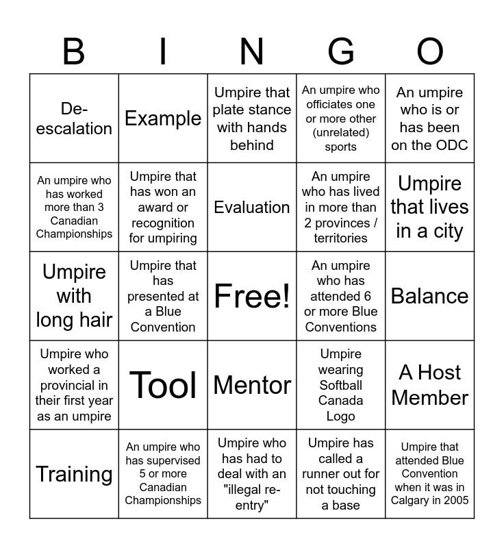 This bingo card has a free space and 24 words: Tool, An umpire who has supervised 5 or more Canadian Championships, Evaluation, Training, An umpire who is or has been on the ODC, De-escalation, An umpire who has worked more than 3 Canadian Championships, Example, An umpire who has attended 6 or more Blue Conventions, Mentor, An umpire who has lived in more than 2 provinces / territories, Umpire with long hair, Umpire wearing Softball Canada Logo, A Host Member, Umpire that has won an award or recognition for umpiring, Umpire has called a runner out for not touching a base, Balance, Umpire that plate stance with hands behind, Umpire that lives in a city, Umpire that has presented at a Blue Convention, Umpire that attended Blue Convention when it was in Calgary in 2005, Umpire who worked a provincial in their first year as an umpire, An umpire who officiates one or more other (unrelated) sports and Umpire who has had to deal with an "illegal re-entry".
