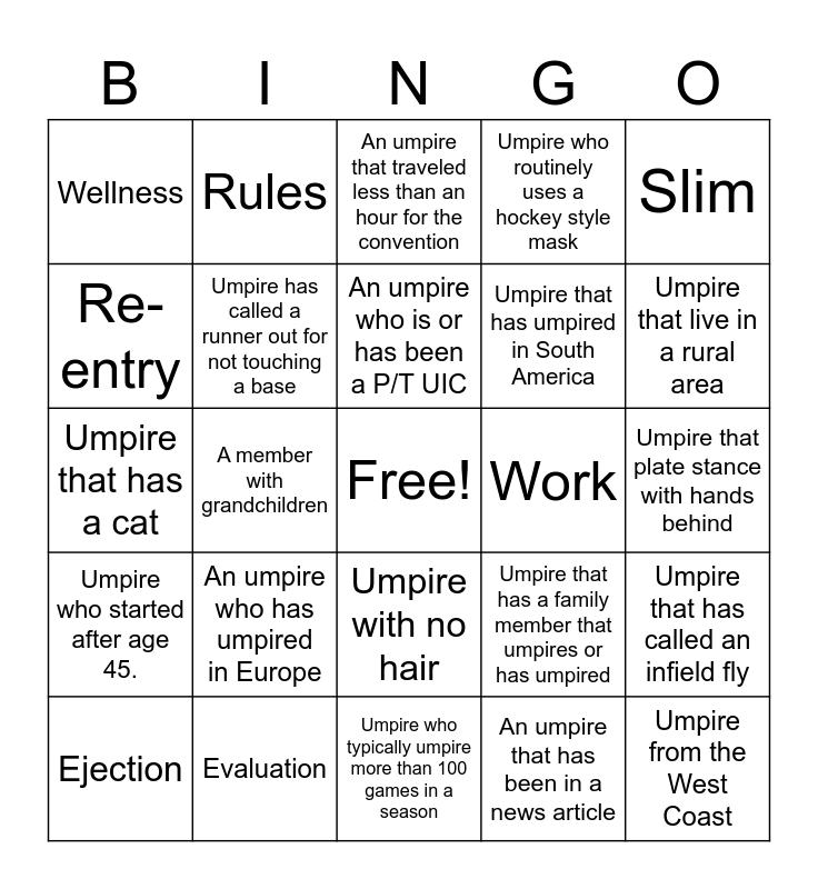 This bingo card has a free space and 24 words: An umpire who has umpired in Europe, Evaluation, An umpire who is or has been a P/T UIC, Ejection, Slim, Wellness, Re-entry, Rules, Work, Umpire with no hair, Umpire that has umpired in South America, Umpire that has a cat, Umpire that has a family member that umpires or has umpired, Umpire that has called an infield fly, Umpire has called a runner out for not touching a base, An umpire that has been in a news article, Umpire that plate stance with hands behind, An umpire that traveled less than an hour for the convention, Umpire that live in a rural area, A member with grandchildren, Umpire from the West Coast, Umpire who started after age 45., Umpire who routinely uses a hockey style mask and Umpire who typically umpire more than 100 games in a season.