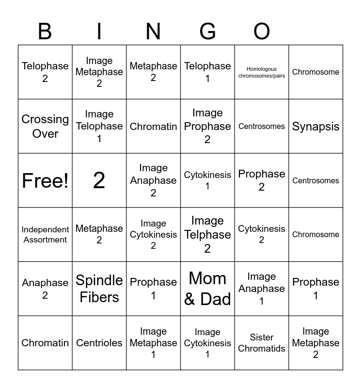 This bingo card has 36 words: Mom & Dad, Prophase 1, Image Cytokinesis 1, Crossing Over, Independent Assortment, Cytokinesis 1, Image Telophase 1, Image Metaphase 1, Homologous chromosomes/pairs, Image Anaphase 1, Synapsis, Telophase 1, Prophase 1, 2, Image Prophase 2, Telophase 2, Anaphase 2, Prophase 2, Free!, Metaphase 2, Image Anaphase 2, Metaphase 2, Image Telphase 2, Image Cytokinesis 2, Cytokinesis 2, Image Metaphase 2, Centrosomes, Centrioles, Chromatin, Chromosome, Image Metaphase 2, Chromatin, Chromosome, Centrosomes, Spindle Fibers and Sister Chromatids.