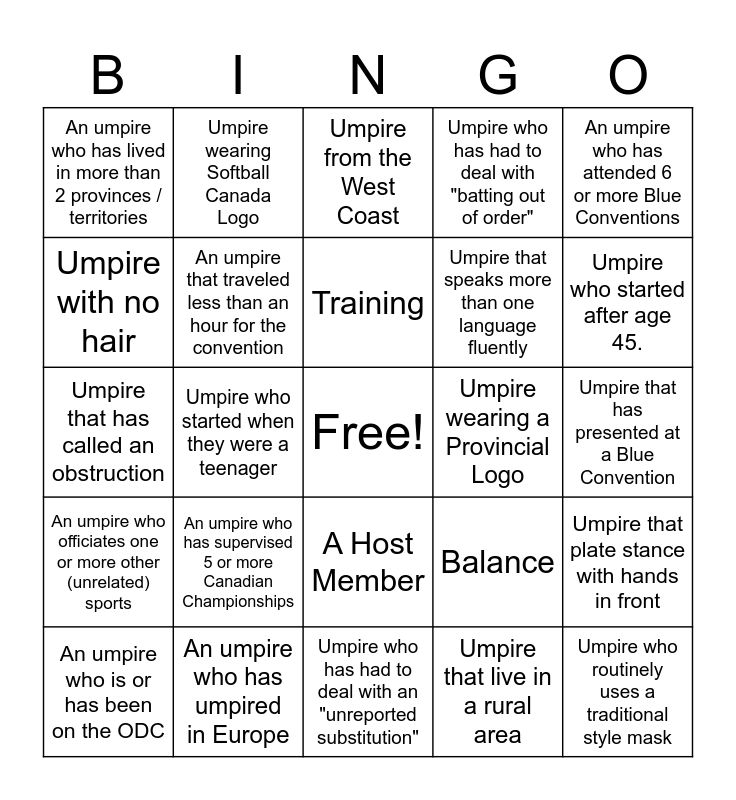 This bingo card has a free space and 24 words: An umpire who has supervised 5 or more Canadian Championships, An umpire who has umpired in Europe, Training, An umpire who is or has been on the ODC, An umpire who has attended 6 or more Blue Conventions, An umpire who has lived in more than 2 provinces / territories, Umpire with no hair, Umpire wearing Softball Canada Logo, Umpire wearing a Provincial Logo, A Host Member, Umpire that speaks more than one language fluently, Umpire that has called an obstruction, Balance, Umpire that plate stance with hands in front, An umpire that traveled less than an hour for the convention, Umpire that live in a rural area, Umpire that has presented at a Blue Convention, Umpire from the West Coast, Umpire who started after age 45., Umpire who started when they were a teenager, Umpire who routinely uses a traditional style mask, An umpire who officiates one or more other (unrelated) sports, Umpire who has had to deal with "batting out of order" and Umpire who has had to deal with an "unreported substitution".