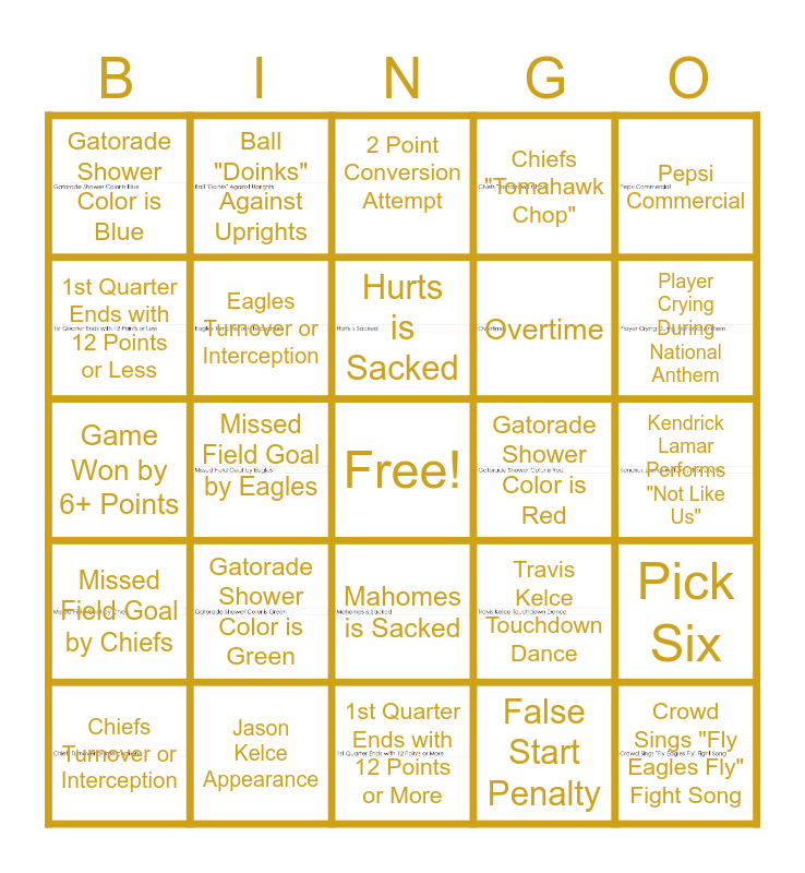 This bingo card has 31 images, a free space and 39 words: 3-Peat is Mentioned, Patrick Mahomes Scores a Touchodwn Himself, Taylor Swift Sighting, Eagles Turnover or Interception, Chiefs Turnover or Interception, Mahomes is Sacked, Hurts is Sacked, Saquon Barkley Rushes for 100+ Yards, Pepsi Commercial, Missed Field Goal by Chiefs, Missed Field Goal by Eagles, Chiefs "Tomahawk Chop", Crowd Sings "Fly Eagles Fly" Fight Song, Kendrick Lamar Performs "Not Like Us", Gatorade Shower Color is Red, Gatorade Shower Color is Green, Gatorade Shower Color is Yellow, Gatorade Shower Color is Blue, Eagles Use the "Tush Push" Play, Travis Kelce Touchdown Dance, 1st Quarter Ends with 12 Points or Less, 1st Quarter Ends with 12 Points or More, Overtime, Player Crying During National Anthem, 2 or More Sports Betting Commercials, Car Commercial, Eagles Win, Chiefs Win, Tom Brady is Called the "GOAT", Ball "Doinks" Against Uprights, Either Team Fakes a Punt, "I'm Going to Disneyland!", 2 Point Conversion Attempt, Jason Kelce Appearance, False Start Penalty, Holding Penalty, Pick Six, Game Won by 6+ Points and Lil Wayne Appearance at Halftime Show.