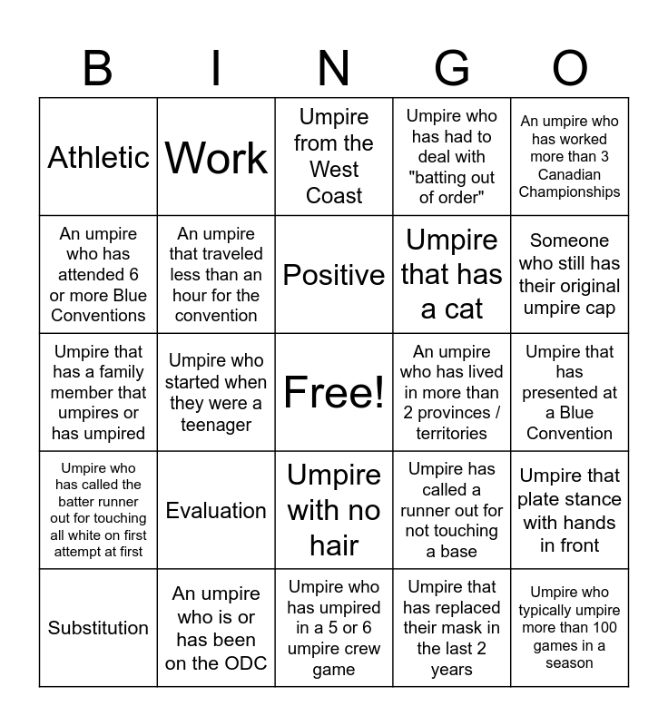 This bingo card has a free space and 24 words: Evaluation, An umpire who is or has been on the ODC, Positive, Substitution, An umpire who has worked more than 3 Canadian Championships, Athletic, An umpire who has attended 6 or more Blue Conventions, Work, An umpire who has lived in more than 2 provinces / territories, Umpire with no hair, Umpire that has a cat, Umpire that has a family member that umpires or has umpired, Umpire has called a runner out for not touching a base, Umpire that plate stance with hands in front, An umpire that traveled less than an hour for the convention, Umpire that has replaced their mask in the last 2 years, Umpire that has presented at a Blue Convention, Umpire from the West Coast, Someone who still has their original umpire cap, Umpire who started when they were a teenager, Umpire who typically umpire more than 100 games in a season, Umpire who has called the batter runner out for touching all white on first attempt at first, Umpire who has had to deal with "batting out of order" and Umpire who has umpired in a 5 or 6 umpire crew game.