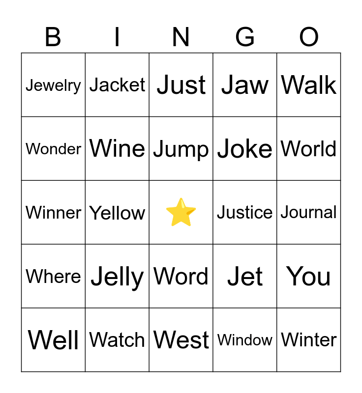 This bingo card has a free space and 34 words: Water, Window, Wall, Wait, Where, Wine, Walk, Well, Jacket, Juice, Jump, Just, Joy, Jungle, Justice, World, Watch, Winner, Jelly, Jet, Word, Worship, Jewelry, Journal, West, Winter, Jaw, Witch, Joke, Wonder, Uniform, Yellow, You and Whole.