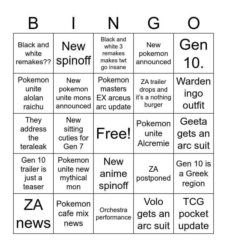 This bingo card has a free space and 24 words: Pokemon unite new mythical mon, Pokemon cafe mix news, Pokemon masters EX arceus arc update, ZA news, Gen 10., Black and white remakes??, Pokemon unite alolan raichu, New spinoff, Pokemon unite Alcremie, New anime spinoff, ZA trailer drops and it’s a nothing burger, They address the teraleak, ZA postponed, Gen 10 is a Greek region, New pokemon unite mons announced, Volo gets an arc suit, Geeta gets an arc suit, Black and white 3 remakes makes twt go insane, Warden ingo outfit, New sitting cuties for Gen 7, TCG pocket update, Gen 10 trailer is just a teaser, New pokemon announced and Orchestra performance.