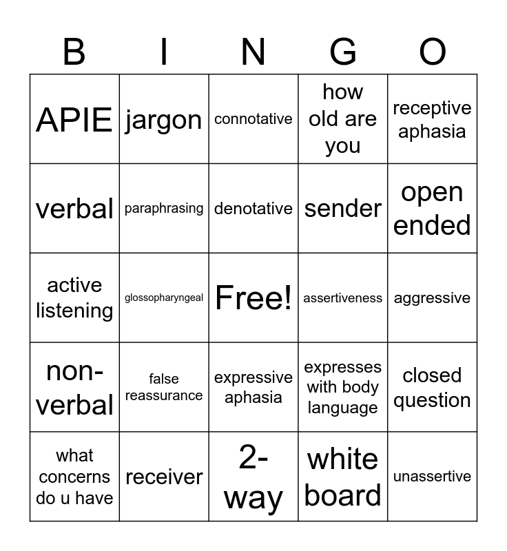 This bingo card has a free space and 27 words: expresses with body language, sign language, sender, 2-way, verbal, connotative, jargon, non-verbal, assertiveness, closed question, active listening, how old are you, what concerns do u have, receiver, open ended, therapeutic, paraphrasing, denotative, false reassurance, APIE, aggressive, white board, glossopharyngeal, unassertive, expressive aphasia, receptive aphasia and CN 8.