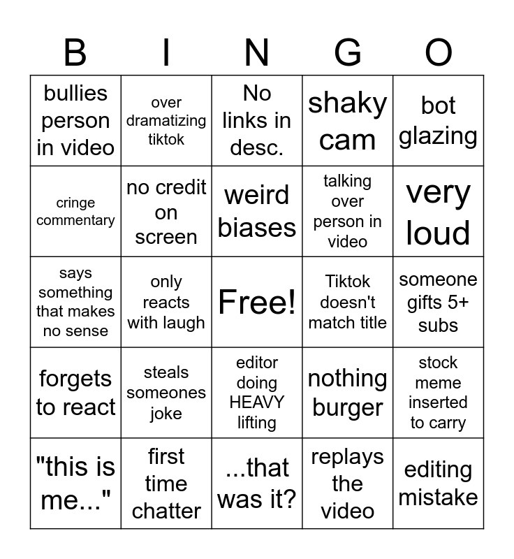 This bingo card has a free space and 24 words: steals someones joke, first time chatter, weird biases, "this is me...", bot glazing, bullies person in video, cringe commentary, over dramatizing tiktok, Tiktok doesn't match title, editor doing HEAVY lifting, talking over person in video, says something that makes no sense, nothing burger, stock meme inserted to carry, no credit on screen, replays the video, someone gifts 5+ subs, No links in desc., very loud, only reacts with laugh, editing mistake, forgets to react, shaky cam and ...that was it?.