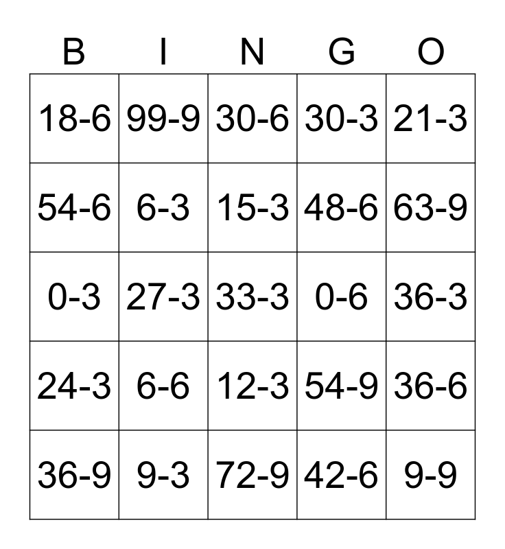 This bingo card has 40 words: Free!, 0-3, 3-3, 6-3, 9-3, 12-3, 15-3, 18-3, 21-3, 24-3, 27-3, 30-3, 33-3, 36-3, 0-6, 6-6, 12-6, 18-6, 24-6, 30-6, 36-6, 42-6, 48-6, 54-6, 60-6, 66-6, 72-6, 0-9, 9-9, 18-9, 27-9, 36-9, 45-9, 54-9, 63-9, 72-9, 81-9, 90-9, 99-9 and 108-9.