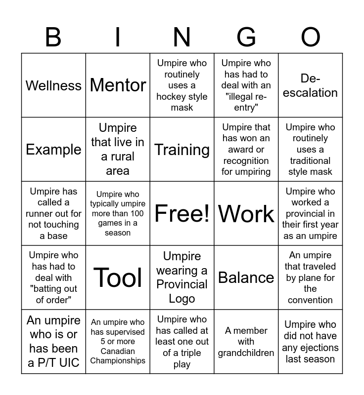 This bingo card has a free space and 24 words: Tool, An umpire who has supervised 5 or more Canadian Championships, Training, An umpire who is or has been a P/T UIC, De-escalation, Wellness, Example, Mentor, Work, Umpire wearing a Provincial Logo, Umpire that has won an award or recognition for umpiring, Umpire has called a runner out for not touching a base, Balance, An umpire that traveled by plane for the convention, Umpire that live in a rural area, A member with grandchildren, Umpire who worked a provincial in their first year as an umpire, Umpire who routinely uses a hockey style mask, Umpire who routinely uses a traditional style mask, Umpire who typically umpire more than 100 games in a season, Umpire who did not have any ejections last season, Umpire who has had to deal with "batting out of order", Umpire who has had to deal with an "illegal re-entry" and Umpire who has called at least one out of a triple play.