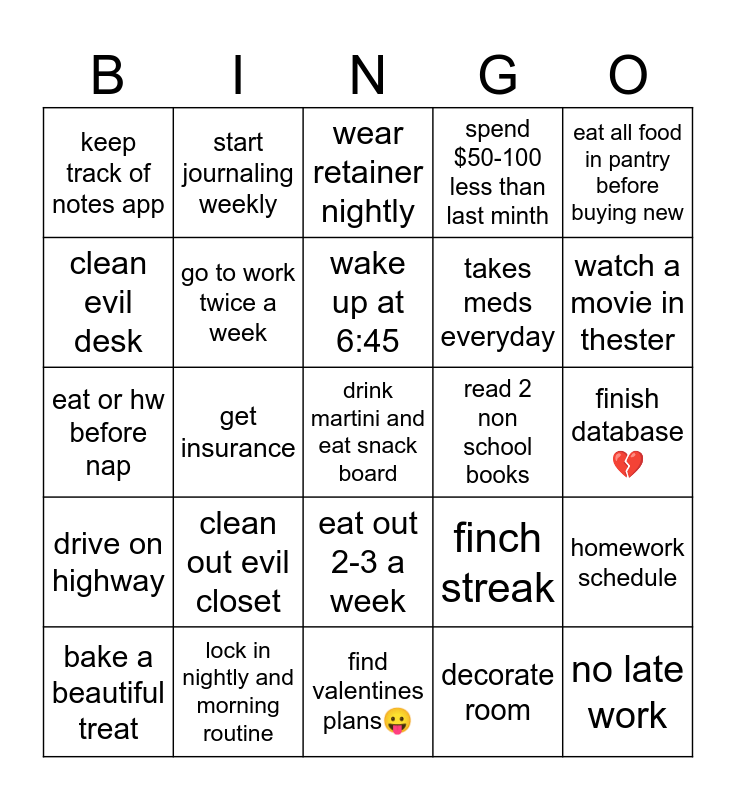 This bingo card has a free space and 24 words: clean out evil closet, lock in nightly and morning routine, wake up at 6:45, bake a beautiful treat, eat all food in pantry before buying new, keep track of notes app, clean evil desk, start journaling weekly, read 2 non school books, eat out 2-3 a week, takes meds everyday, eat or hw before nap, finch streak, homework schedule, go to work twice a week, decorate room, finish database💔, wear retainer nightly, watch a movie in thester, get insurance, no late work, drive on highway, spend $50-100 less than last minth and find valentines plans😛.