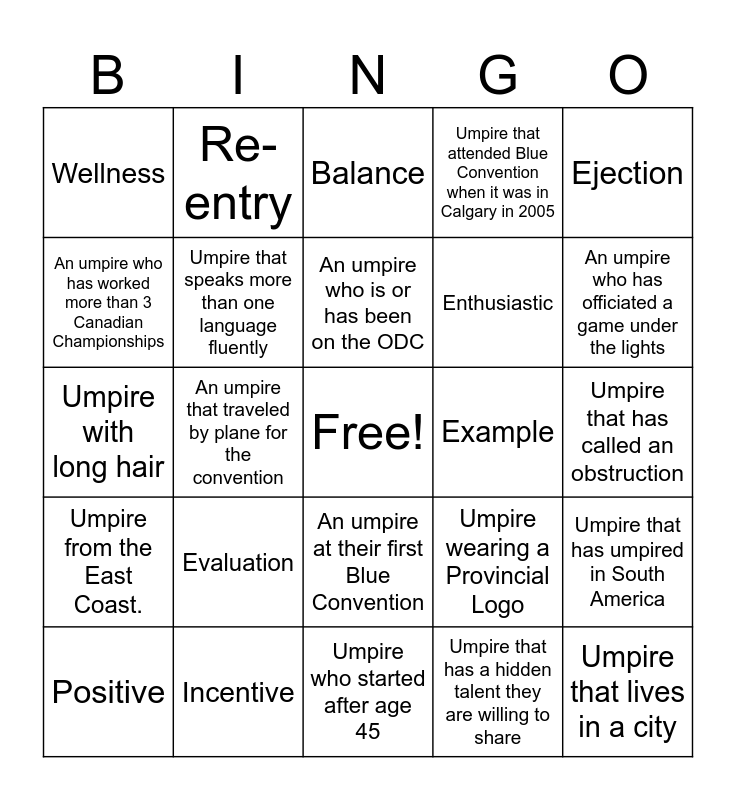 This bingo card has a free space and 24 words: Evaluation, Incentive, An umpire who is or has been on the ODC, Positive, Ejection, Wellness, An umpire who has worked more than 3 Canadian Championships, Re-entry, Example, An umpire at their first Blue Convention, Enthusiastic, Umpire with long hair, Umpire wearing a Provincial Logo, Umpire that has umpired in South America, Umpire that speaks more than one language fluently, Umpire that has a hidden talent they are willing to share, Umpire that has called an obstruction, Balance, An umpire who has officiated a game under the lights, An umpire that traveled by plane for the convention, Umpire that lives in a city, Umpire from the East Coast., Umpire that attended Blue Convention when it was in Calgary in 2005 and Umpire who started after age 45.
