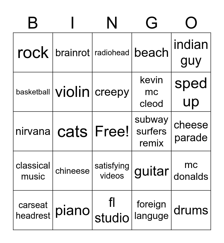 This bingo card has a free space and 24 words: chineese, piano, creepy, carseat headrest, indian guy, rock, basketball, brainrot, subway surfers remix, satisfying videos, kevin mc cleod, nirvana, guitar, mc donalds, violin, foreign languge, cheese parade, radiohead, sped up, cats, drums, classical music, beach and fl studio.
