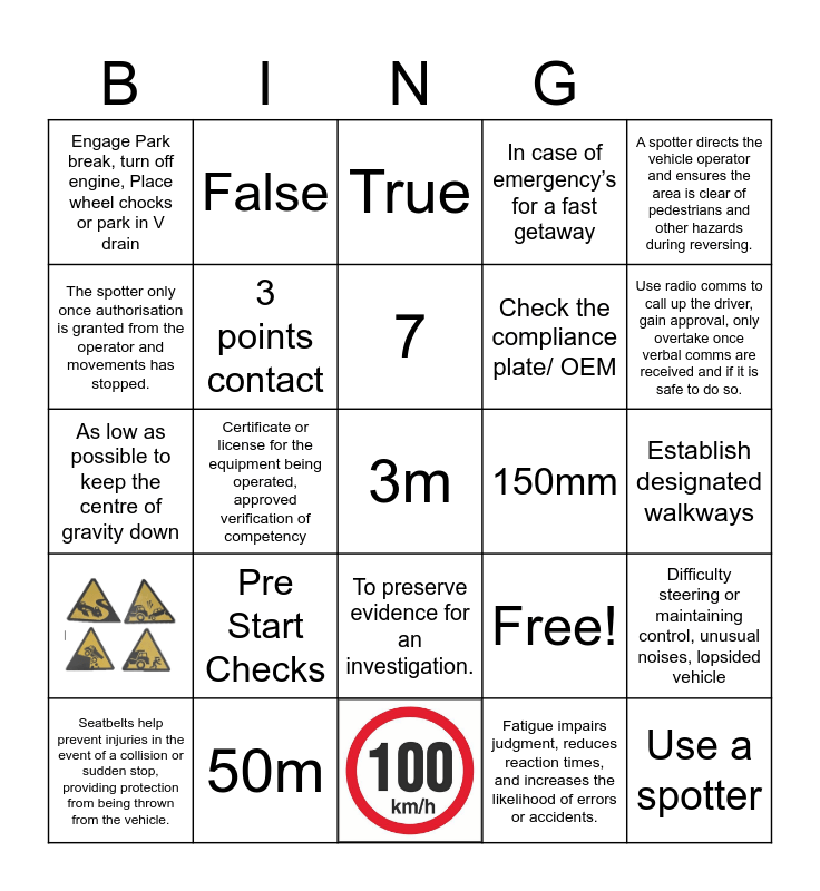 This bingo card has 2 images and 23 words: Pre Start Checks, 7, Seatbelts help prevent injuries in the event of a collision or sudden stop, providing protection from being thrown from the vehicle., A spotter directs the vehicle operator and ensures the area is clear of pedestrians and other hazards during reversing., Engage Park break, turn off engine, Place wheel chocks or park in V drain, The spotter only once authorisation is granted from the operator and movements has stopped., False, 150mm, To preserve evidence for an investigation., Check the compliance plate/ OEM, As low as possible to keep the centre of gravity down, Free!, Difficulty steering or maintaining control, unusual noises, lopsided vehicle, 3 points contact, Use a spotter, Establish designated walkways, True, Use radio comms to call up the driver, gain approval, only overtake once verbal comms are received and if it is safe to do so., Certificate or license for the equipment being operated, approved verification of competency, 3m, 50m, In case of emergency’s for a fast getaway and Fatigue impairs judgment, reduces reaction times, and increases the likelihood of errors or accidents..