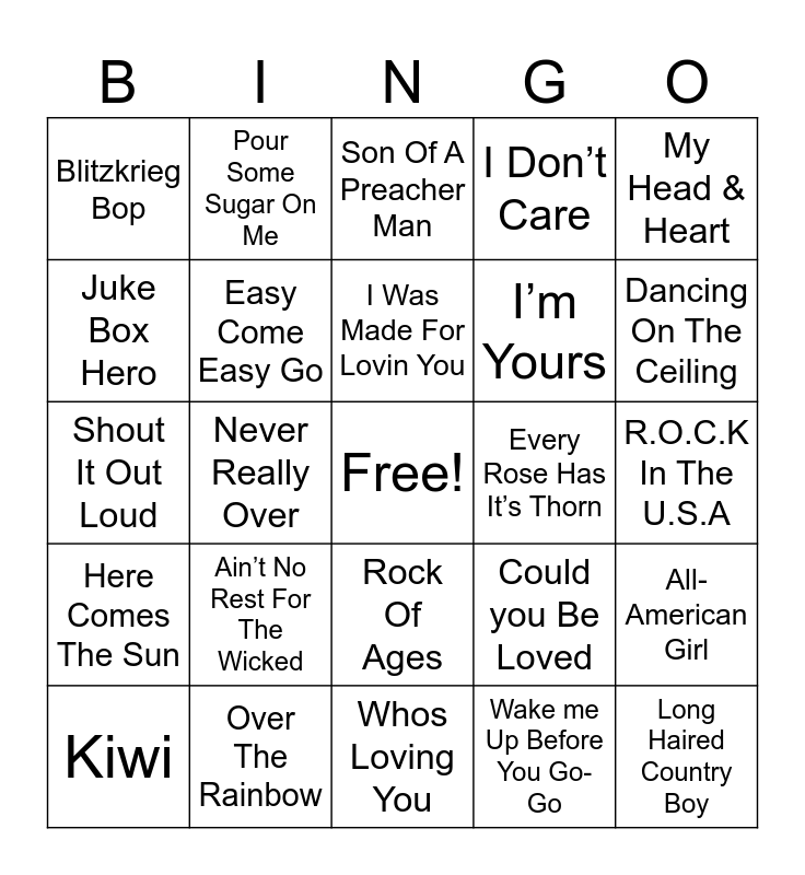 This bingo card has a free space and 66 words: We’re Not gonna Take It, Heads Will Roll, What About Us, All- American Girl, The Breaks, Ladies Choice, Pour Some Sugar On Me, Same Ol’ Situation ( S.O.S), I Was Made For Lovin You, Footloose, Rock Of Ages, Take me Home Tonight, R.O.C.K In The U.S.A, My Head & Heart, Hold Me Closer, Juke Box Hero, Never Really Over, Blitzkrieg Bop, Sunday Best, I’m Yours, Ain’t No Rest For The Wicked, Here Comes The Sun, I Don’t Care, Ho Hey, Dance Monkey, Jump, You Can't Hurry Love, Nutbush City Limits, Long Haired Country Boy, Dancing Queen, Kiwi, Adore You, Wanna Be Startin’ Somethin’, Scream, Could you Be Loved, Over The Rainbow, Piano, Shout It Out Loud, Wake me Up Before You Go-Go, Hair Of A Dog, Easy Come Easy Go, Rock You Like A Hurricane, Every Rose Has It’s Thorn, It’s Time, I Still Haven't Found What I’m Looking For, Gloria, Dancing On The Ceiling, Let's Hear It For The Boys, Problem, Sweet Child O’ Mine, Whip My Hair, Pon De Replay, Countdown, Made You Look, Proud Mary, Karma Chameleon, Kiss, Dressed For Success, Son Of A Preacher Man, Whos Loving You, Hair, 2 Be Loved ( Am I ready), Maybe You're The Problem, Got My Mind Set On You, Old Time Rock & Roll and Come On Eileen.