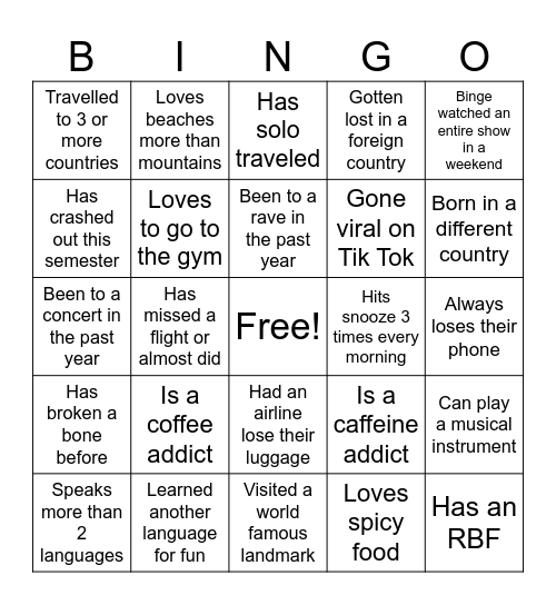 This bingo card has a free space and 24 words: Speaks more than 2 languages, Is a coffee addict, Been to a rave in the past year, Loves spicy food, Binge watched an entire show in a weekend, Travelled to 3 or more countries, Loves beaches more than mountains, Has solo traveled, Hits snooze 3 times every morning, Always loses their phone, Been to a concert in the past year, Loves to go to the gym, Is a caffeine addict, Can play a musical instrument, Has crashed out this semester, Learned another language for fun, Visited a world famous landmark, Gotten lost in a foreign country, Born in a different country, Has broken a bone before, Has missed a flight or almost did, Had an airline lose their luggage, Gone viral on Tik Tok and Has an RBF.