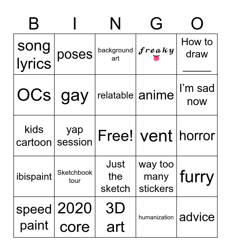 This bingo card has a free space and 24 words: Sketchbook tour, 2020 core, relatable, speed paint, How to draw _____, song lyrics, OCs, poses, vent, Just the sketch, anime, kids cartoon, way too many stickers, furry, gay, humanization, horror, background art, Iām sad now, yap session, advice, ibispaint, šÆš»š®šŖš“š š and 3D art.