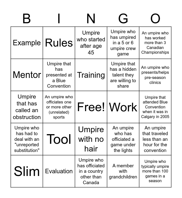 This bingo card has a free space and 24 words: Tool, Evaluation, Training, Slim, An umpire who has worked more than 3 Canadian Championships, Example, Mentor, Rules, Work, Umpire with no hair, Umpire that has a hidden talent they are willing to share, Umpire that has called an obstruction, An umpire who has officiated a game under the lights, An umpire that traveled less than an hour for the convention, Umpire that has presented at a Blue Convention, A member with grandchildren, Umpire that attended Blue Convention when it was in Calgary in 2005, Umpire who started after age 45, An umpire who presents/helps pre-season clinics, An umpire who officiates one or more other (unrelated) sports, Umpire who typically umpire more than 100 games in a season, Umpire who has had to deal with an "unreported substitution", Umpire who has umpired in a 5 or 6 umpire crew game and Umpire who has officiated in a country other than Canada.