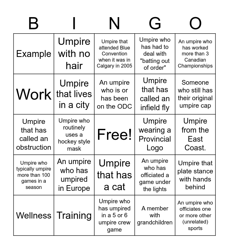 This bingo card has a free space and 24 words: An umpire who has umpired in Europe, Training, An umpire who is or has been on the ODC, Wellness, An umpire who has worked more than 3 Canadian Championships, Example, Work, Umpire with no hair, Umpire wearing a Provincial Logo, Umpire that has a cat, Umpire that has called an infield fly, Umpire that has called an obstruction, An umpire who has officiated a game under the lights, Umpire that plate stance with hands behind, Umpire that lives in a city, A member with grandchildren, Umpire from the East Coast., Umpire that attended Blue Convention when it was in Calgary in 2005, Someone who still has their original umpire cap, Umpire who routinely uses a hockey style mask, An umpire who officiates one or more other (unrelated) sports, Umpire who typically umpire more than 100 games in a season, Umpire who has had to deal with "batting out of order" and Umpire who has umpired in a 5 or 6 umpire crew game.