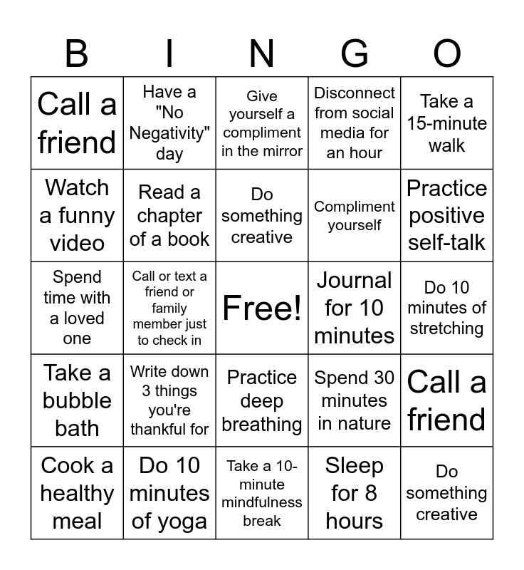This bingo card has a free space and 24 words: Write down 3 things you're thankful for, Do 10 minutes of yoga, Do something creative, Cook a healthy meal, Take a 15-minute walk, Call a friend, Watch a funny video, Have a "No Negativity" day, Journal for 10 minutes, Practice deep breathing, Compliment yourself, Spend time with a loved one, Spend 30 minutes in nature, Call a friend, Read a chapter of a book, Sleep for 8 hours, Do 10 minutes of stretching, Give yourself a compliment in the mirror, Practice positive self-talk, Call or text a friend or family member just to check in, Do something creative, Take a bubble bath, Disconnect from social media for an hour and Take a 10-minute mindfulness break.