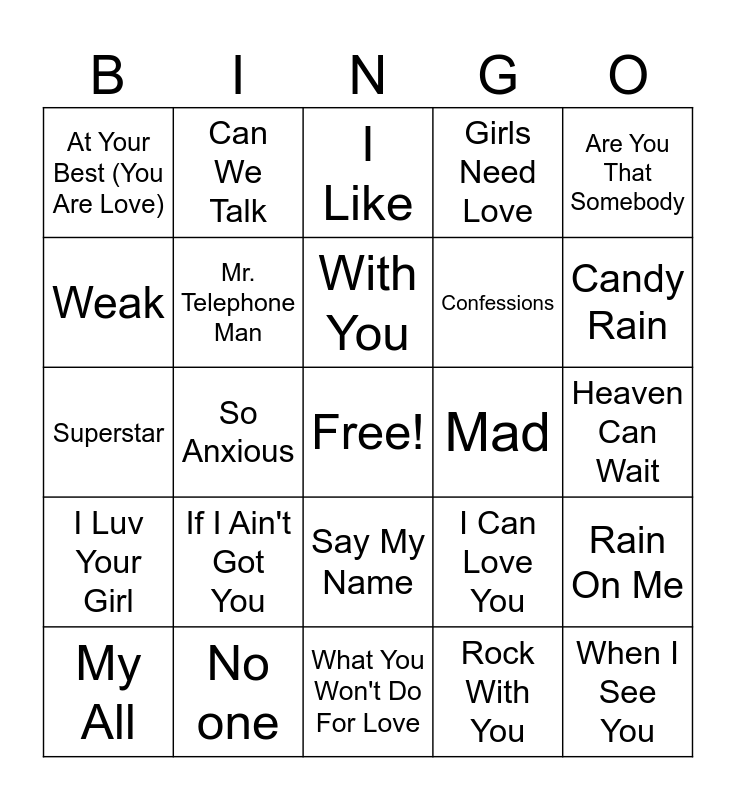 This bingo card has a free space and 24 words: If I Ain't Got You, No one, With You, My All, Are You That Somebody, At Your Best (You Are Love), Weak, Can We Talk, Mad, Say My Name, Confessions, Superstar, I Can Love You, Rain On Me, Mr. Telephone Man, Rock With You, Heaven Can Wait, I Like, Candy Rain, So Anxious, When I See You, I Luv Your Girl, Girls Need Love and What You Won't Do For Love.