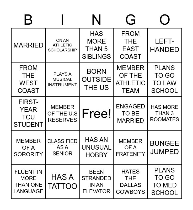 This bingo card has a free space and 24 words: CLASSIFIED AS A SENIOR, HAS A TATTOO, BORN OUTSIDE THE US, FLUENT IN MORE THAN ONE LANGUAGE, LEFT-HANDED, MARRIED, FROM THE WEST COAST, ON AN ATHLETIC SCHOLARSHIP, ENGAGED TO BE MARRIED, HAS AN UNUSUAL HOBBY, MEMBER OF THE ATHLETIC TEAM, FIRST-YEAR TCU STUDENT, MEMBER OF A FRATENITY, BUNGEE JUMPED, PLAYS A MUSICAL INSTRUMENT, HATES THE DALLAS COWBOYS, HAS MORE THAN 3 ROOMATES, HAS MORE THAN 5 SIBLINGS, PLANS TO GO TO LAW SCHOOL, MEMBER OF THE U.S RESERVES, PLANS TO GO TO MED SCHOOL, MEMBER OF A SORORITY, FROM THE EAST COAST and BEEN STRANDED IN AN ELEVATOR.