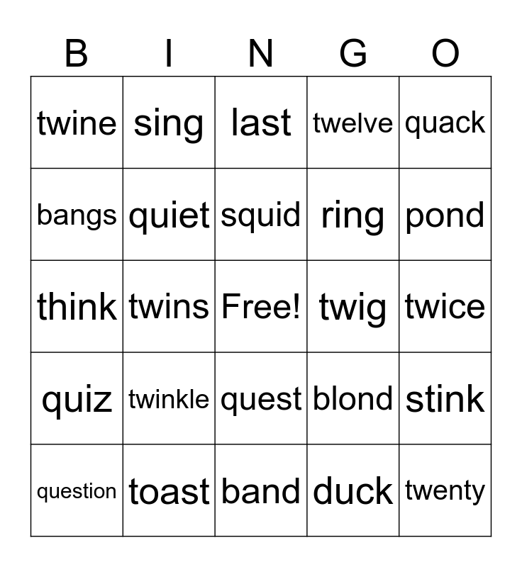 This bingo card has a free space and 39 words: quit, quilt, queen, quiet, question, quest, squid, quick, quack, quiz, twins, twelve, twenty, twice, twig, twinkle, twist, twine, tweet, blond, bangs, band, ring, pond, hand, sting, gang, milk, talk, sing, walk, first, last, toast, duck, sock, stink, think and white.
