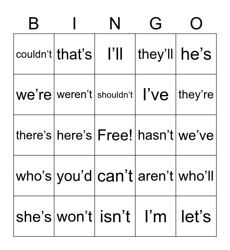 This bingo card has a free space and 32 words: I’m, haven’t, here’s, you’re, who’s, weren’t, he’s, who’ll, that’s, I’d, shouldn’t, I’ll, they’ve, what’s, hasn’t, she’ll, she’s, there’s, can’t, you’d, aren’t, don’t, we’ve, won’t, let’s, they’ll, I’ve, we’re, couldn’t, isn’t, didn’t and they’re.