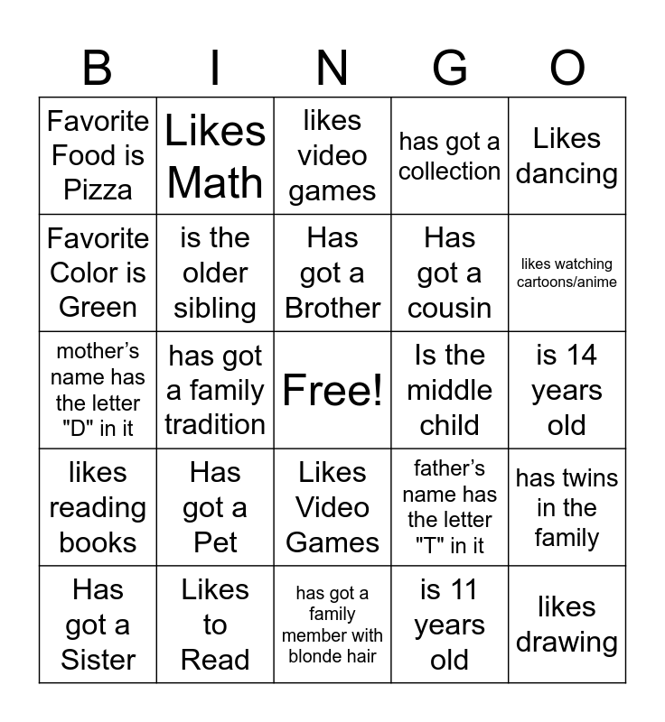 This bingo card has a free space and 24 words: Has got a Pet, Likes to Read, Has got a Brother, Has got a Sister, Likes dancing, Favorite Food is Pizza, Favorite Color is Green, Likes Math, Is the middle child, Likes Video Games, Has got a cousin, mother’s name has the letter "D" in it, father’s name has the letter "T" in it, has twins in the family, is the older sibling, is 11 years old, is 14 years old, likes video games, likes watching cartoons/anime, has got a family tradition, likes drawing, likes reading books, has got a collection and has got a family member with blonde hair.