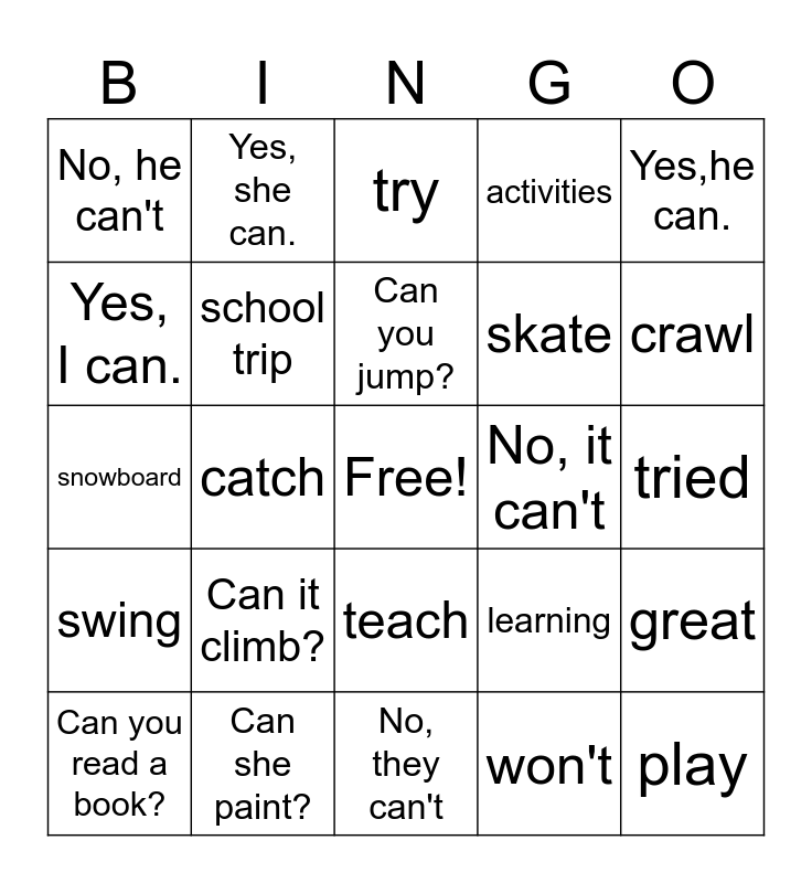 This bingo card has a free space and 24 words: Can it climb?, Can she paint?, Can you jump?, Can you read a book?, Yes,he can., No, he can't, Yes, I can., Yes, she can., No, it can't, teach, skate, snowboard, learning, great, school trip, won't, tried, try, crawl, catch, play, swing, activities and No, they can't.