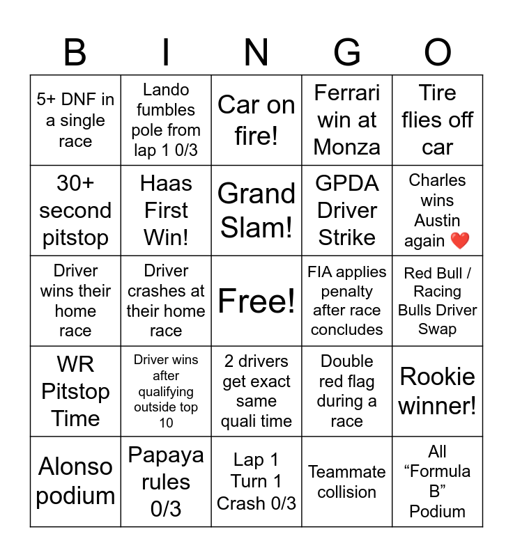 This bingo card has a free space and 24 words: Driver wins after qualifying outside top 10, Papaya rules 0/3, Grand Slam!, Alonso podium, Tire flies off car, 5+ DNF in a single race, 30+ second pitstop, Lando fumbles pole from lap 1 0/3, FIA applies penalty after race concludes, 2 drivers get exact same quali time, GPDA Driver Strike, Driver wins their home race, Double red flag during a race, Rookie winner!, Haas First Win!, Teammate collision, Red Bull / Racing Bulls Driver Swap, Car on fire!, Charles wins Austin again ❤️, Driver crashes at their home race, All “Formula B” Podium, WR Pitstop Time, Ferrari win at Monza and Lap 1 Turn 1 Crash 0/3.