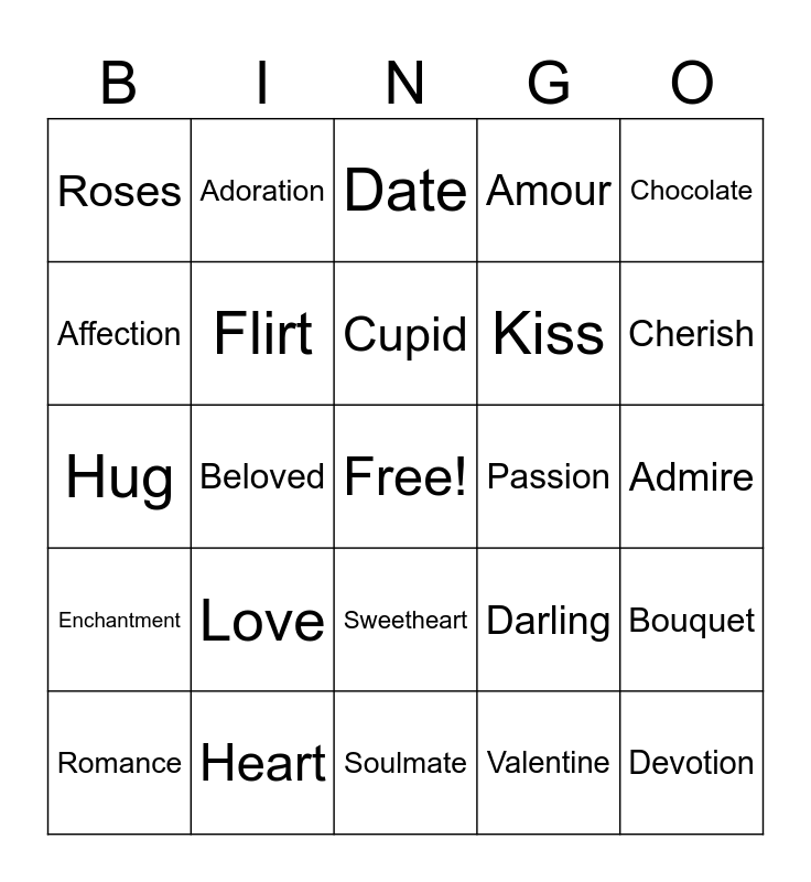 This bingo card has a free space and 24 words: Love, Heart, Cupid, Romance, Chocolate, Roses, Affection, Adoration, Passion, Sweetheart, Kiss, Hug, Darling, Bouquet, Flirt, Valentine, Admire, Date, Cherish, Beloved, Devotion, Enchantment, Amour and Soulmate.