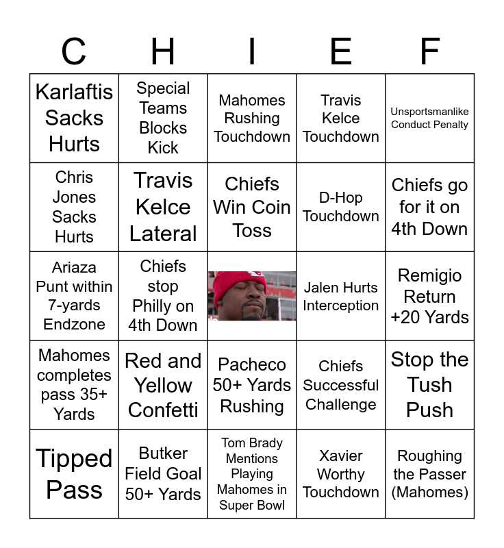 This bingo card has a free space and 29 words: Tipped Pass, Philly Fumble!, Chiefs stop Philly on 4th Down, Hunt Touchdown, Karlaftis Sacks Hurts, Mahomes Rushing Touchdown, Travis Kelce Lateral, Red and Yellow Confetti, Jalen Hurts Interception, Butker Field Goal 50+ Yards, Remigio Return +20 Yards, Roughing the Passer (Mahomes), Tom Brady Mentions Playing Mahomes in Super Bowl, Xavier Worthy Touchdown, Chiefs go for it on 4th Down, OVERTIME, Pacheco 50+ Yards Rushing, Mahomes completes pass 35+ Yards, Unsportsmanlike Conduct Penalty, Ariaza Punt within 7-yards Endzone, Chiefs Successful Challenge, Hollywood Brown 25+ Yard Catch, D-Hop Touchdown, Chris Jones Sacks Hurts, Travis Kelce Touchdown, Special Teams Blocks Kick, Stop the Tush Push, Chiefs Win Coin Toss and Chiefs Injure Philly Player.