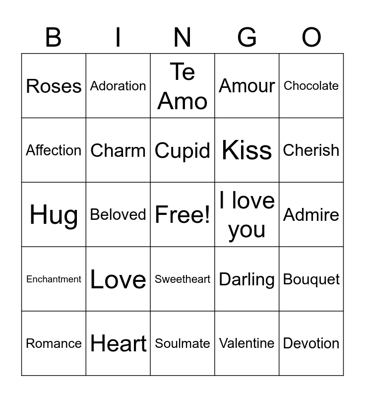 This bingo card has a free space and 24 words: Love, Heart, Cupid, Romance, Chocolate, Roses, Affection, Adoration, I love you, Sweetheart, Kiss, Hug, Darling, Bouquet, Charm, Valentine, Admire, Te Amo, Cherish, Beloved, Devotion, Enchantment, Amour and Soulmate.