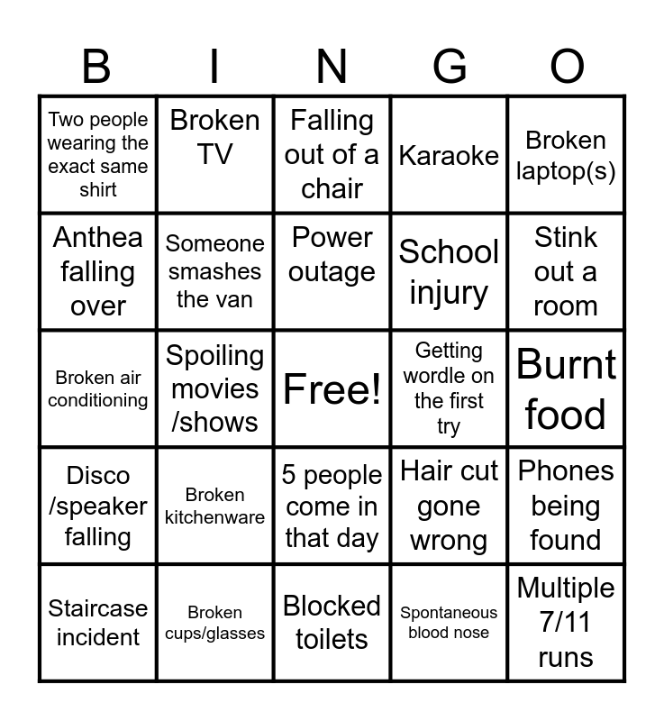This bingo card has a free space and 24 words: Broken kitchenware, Broken cups/glasses, Power outage, Staircase incident, Broken laptop(s), Two people wearing the exact same shirt, Anthea falling over, Broken TV, Getting wordle on the first try, 5 people come in that day, School injury, Broken air conditioning, Hair cut gone wrong, Phones being found, Someone smashes the van, Spontaneous blood nose, Burnt food, Falling out of a chair, Stink out a room, Spoiling movies /shows, Multiple 7/11 runs, Disco /speaker falling, Karaoke and Blocked toilets.