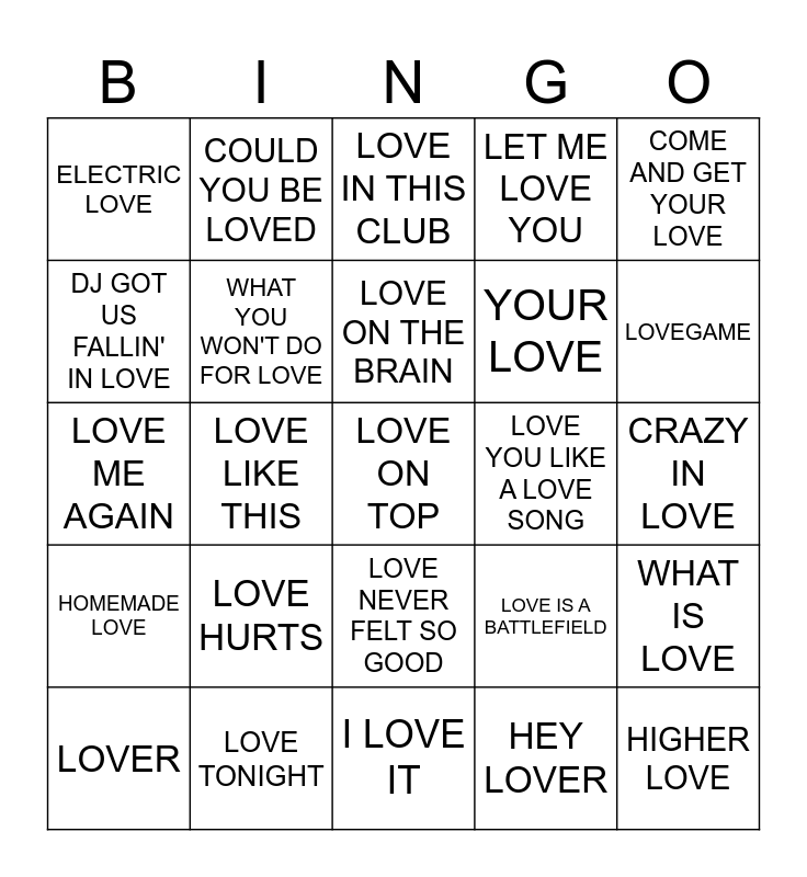 This bingo card has a free space and 33 words: I'M STILL IN LOVE WITH YOU, LIKE I LOVE YOU, LOVE LIKE THIS, WHOLE LOTTA LOVE, HOMEMADE LOVE, WHAT YOU WON'T DO FOR LOVE, COME AND GET YOUR LOVE, LOVER, COULD YOU BE LOVED, LOVEFOOL, LOVE ON THE BRAIN, LOVE IN THIS CLUB, LOVIN ON ME, LOVE SOMEBODY, LOVE YOU LIKE A LOVE SONG, LOVEGAME, LOVE TONIGHT, LOVE ME AGAIN, LOVE HURTS, LOVE IS A BATTLEFIELD, LOVE NEVER FELT SO GOOD, MY LOVE, ELECTRIC LOVE, CRAZY IN LOVE, I LOVE IT, HIGHER LOVE, LET ME LOVE YOU, YOUR LOVE, DJ GOT US FALLIN' IN LOVE, WHAT IS LOVE, LOVE SONG, HEY LOVER and WHAT LOVERS DO.