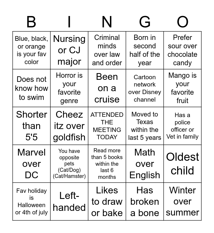 This bingo card has a free space and 24 words: You have opposite pets (Cat/Dog) (Cat/Hamster), Left-handed, Been on a cruise, Fav holiday is Halloween or 4th of july, Prefer sour over chocolate candy, Blue, black, or orange is your fav color, Does not know how to swim, Nursing or CJ major, Moved to Texas within the last 5 years, Read more than 5 books within the last 6 months, Cartoon network over Disney channel, Shorter than 5'5, Math over English, Oldest child, Horror is your favorite genre, Has broken a bone, Has a police officer or Vet in family, Criminal minds over law and order, Mango is your favorite fruit, Cheez itz over goldfish, Winter over summer, Marvel over DC, Born in second half of the year and Likes to draw or bake.