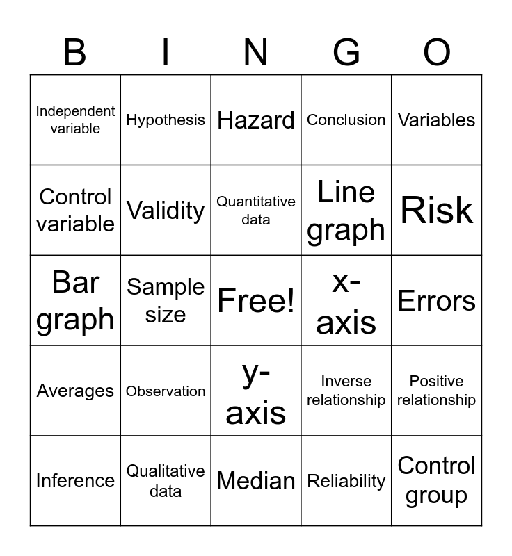 This bingo card has a free space and 24 words: Observation, Qualitative data, Quantitative data, Inference, Variables, Independent variable, Control variable, Hypothesis, x-axis, y-axis, Line graph, Bar graph, Inverse relationship, Positive relationship, Validity, Reliability, Errors, Hazard, Risk, Sample size, Control group, Averages, Conclusion and Median.
