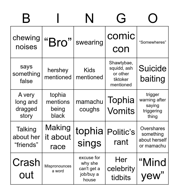 This bingo card has a free space and 24 words: Making it about race, Mispronounces a word, Kids mentioned, Crash out, “Somewheres”, chewing noises, says something false, “Bro”, Tophia Vomits, tophia sings, Shawtybae, squidd, ash or other tiktoker mentioned, A very long and dragged story, Politic’s rant, Overshares something about herself or mamachu, hershey mentioned, Her celebrity tidbits, trigger warning after saying triggering thing, swearing, Suicide baiting, tophia mentions being black, “Mind yew”, Talking about her “friends”, comic con and excuse for why she can't get a job/buy a house.