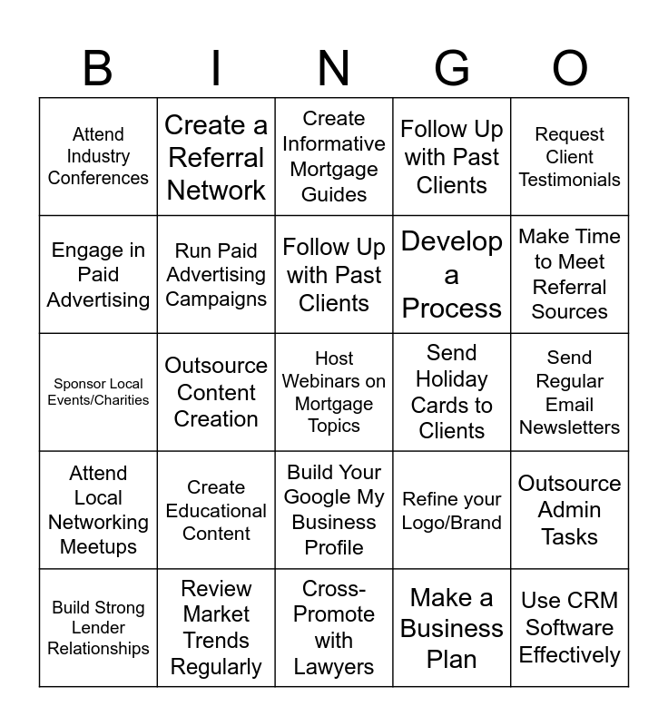 This bingo card has 25 words: Create Educational Content, Cross-Promote with Lawyers, Follow Up with Past Clients, Build Strong Lender Relationships, Request Client Testimonials, Attend Industry Conferences, Engage in Paid Advertising, Create a Referral Network, Send Holiday Cards to Clients, Build Your Google My Business Profile, Develop a Process, Sponsor Local Events/Charities, Refine your Logo/Brand, Outsource Admin Tasks, Run Paid Advertising Campaigns, Use CRM Software Effectively, Send Regular Email Newsletters, Create Informative Mortgage Guides, Make Time to Meet Referral Sources, Outsource Content Creation, Host Webinars on Mortgage Topics, Review Market Trends Regularly, Attend Local Networking Meetups, Follow Up with Past Clients and Make a Business Plan.