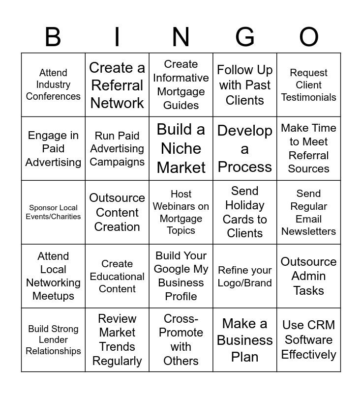 This bingo card has 25 words: Create Educational Content, Cross-Promote with Others, Build a Niche Market, Build Strong Lender Relationships, Request Client Testimonials, Attend Industry Conferences, Engage in Paid Advertising, Create a Referral Network, Send Holiday Cards to Clients, Build Your Google My Business Profile, Develop a Process, Sponsor Local Events/Charities, Refine your Logo/Brand, Outsource Admin Tasks, Run Paid Advertising Campaigns, Use CRM Software Effectively, Send Regular Email Newsletters, Create Informative Mortgage Guides, Make Time to Meet Referral Sources, Outsource Content Creation, Host Webinars on Mortgage Topics, Review Market Trends Regularly, Attend Local Networking Meetups, Follow Up with Past Clients and Make a Business Plan.