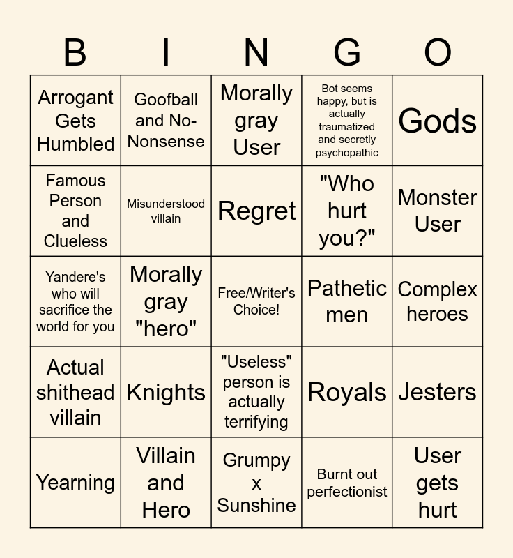This bingo card has a free space and 24 words: Knights, Villain and Hero, Regret, Yearning, Gods, Arrogant Gets Humbled, Famous Person and Clueless, Goofball and No-Nonsense, Pathetic men, "Useless" person is actually terrifying, "Who hurt you?", Yandere's who will sacrifice the world for you, Royals, Jesters, Misunderstood villain, Burnt out perfectionist, Complex heroes, Morally gray User, Monster User, Morally gray "hero", User gets hurt, Actual shithead villain, Bot seems happy, but is actually traumatized and secretly psychopathic and Grumpy x Sunshine.