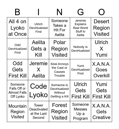 This bingo card has 25 words: Code Lyoko, Forest Region Visited, Polar Region Visited, Mountain Region Visited, Desert Region Visited, All 4 on Lyoko at Once, Odd Devirtualized First, Ulrich Devirtualized First, Yumi Devirtualized First, Someone is Devirtualized Without Getting a Kill, Nobody is Devirtualized, Odd Gets First Kill, Ulrich Gets First Kill, Yumi Gets First Kill, Aelita Gets a Kill, X.A.N.A. Gets Creative, X.A.N.A. Goes Overkill, Someone Takes a Hit For Aelita, Ulrich X Yumi, Jeremie X Aelita, Sissi Annoys the Cast or Causes Trouble, Tower Deactivated at the Last Second, Someone Falls Off or Almost Falls Off Lyoko, Jeremie Explains Real World Stuff to Aelita and Someone Messes Up a Program.