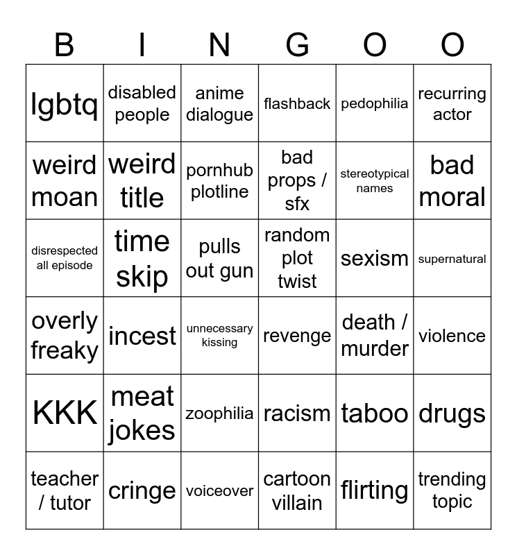 This bingo card has 36 words: racism, zoophilia, cartoon villain, weird moan, overly freaky, random plot twist, weird title, voiceover, pedophilia, taboo, bad moral, flashback, drugs, time skip, bad props / sfx, lgbtq, KKK, sexism, disrespected all episode, anime dialogue, pulls out gun, incest, revenge, unnecessary kissing, death / murder, disabled people, stereotypical names, cringe, pornhub plotline, recurring actor, trending topic, teacher / tutor, violence, supernatural, meat jokes and flirting.