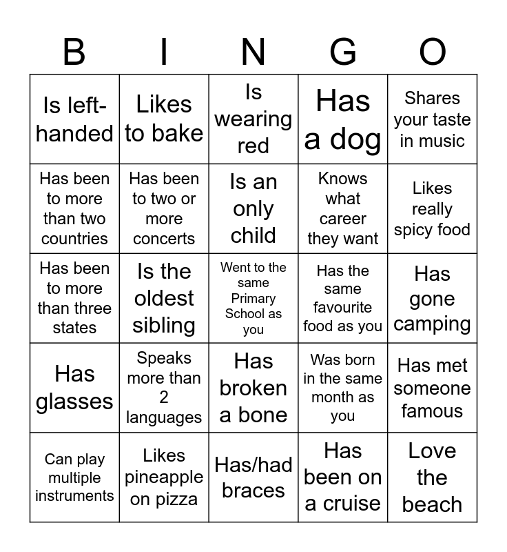 This bingo card has a free space and 24 words: Speaks more than 2 languages, Likes pineapple on pizza, Is an only child, Can play multiple instruments, Shares your taste in music, Is left-handed, Has been to more than two countries, Likes to bake, Has the same favourite food as you, Has broken a bone, Knows what career they want, Has been to more than three states, Was born in the same month as you, Has met someone famous, Has been to two or more concerts, Has been on a cruise, Has gone camping, Is wearing red, Likes really spicy food, Is the oldest sibling, Love the beach, Has glasses, Has a dog and Has/had braces.