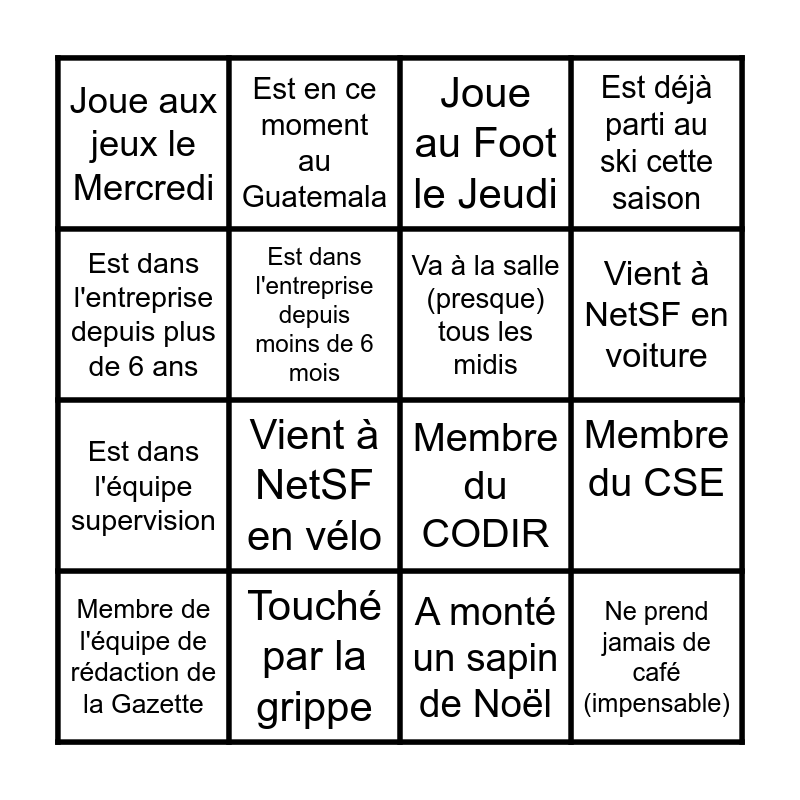 This bingo card has 16 words: Touché par la grippe, Membre du CSE, Joue au Foot le Jeudi, Joue aux jeux le Mercredi, Est dans l'équipe supervision, Est en ce moment au Guatemala, Membre du CODIR, A monté un sapin de Noël, Est dans l'entreprise depuis plus de 6 ans, Est dans l'entreprise depuis moins de 6 mois, Membre de l'équipe de rédaction de la Gazette, Est déjà parti au ski cette saison, Vient à NetSF en vélo, Vient à NetSF en voiture, Va à la salle (presque) tous les midis and Ne prend jamais de café (impensable).