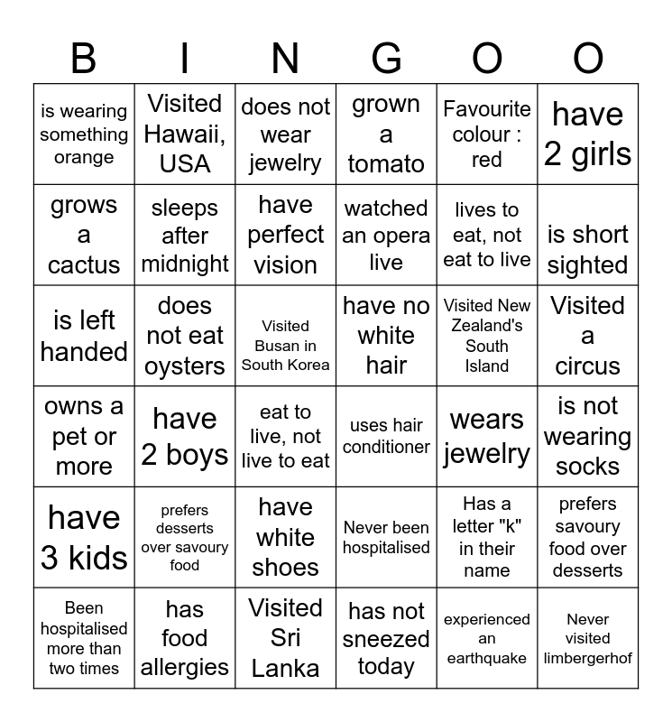 This bingo card has 36 words: Never been hospitalised, have white shoes, has not sneezed today, grows a cactus, owns a pet or more, have no white hair, sleeps after midnight, Visited Sri Lanka, Favourite colour : red, Has a letter "k" in their name, is short sighted, grown a tomato, prefers savoury food over desserts, does not eat oysters, watched an opera live, is wearing something orange, have 3 kids, Visited New Zealand's South Island, is left handed, does not wear jewelry, Visited Busan in South Korea, have 2 boys, uses hair conditioner, eat to live, not live to eat, wears jewelry, Visited Hawaii, USA, lives to eat, not eat to live, has food allergies, have perfect vision, have 2 girls, Never visited limbergerhof, Been hospitalised more than two times, is not wearing socks, Visited a circus, prefers desserts over savoury food and experienced an earthquake.