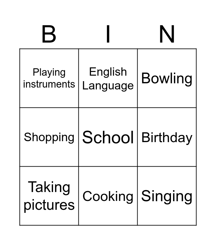 This bingo card has a free space and 23 words: Name, Soccer, Cooking, Swimming, Singing, Playing instruments, Birthday, English Language, Basketball, HighFive, Listening to music, Tennis, Watching TV, Anime, Boxing, HandShake, Bowling, Figure skating, Taking pictures, Volleyball, Shopping, Dancing and Sleeping.