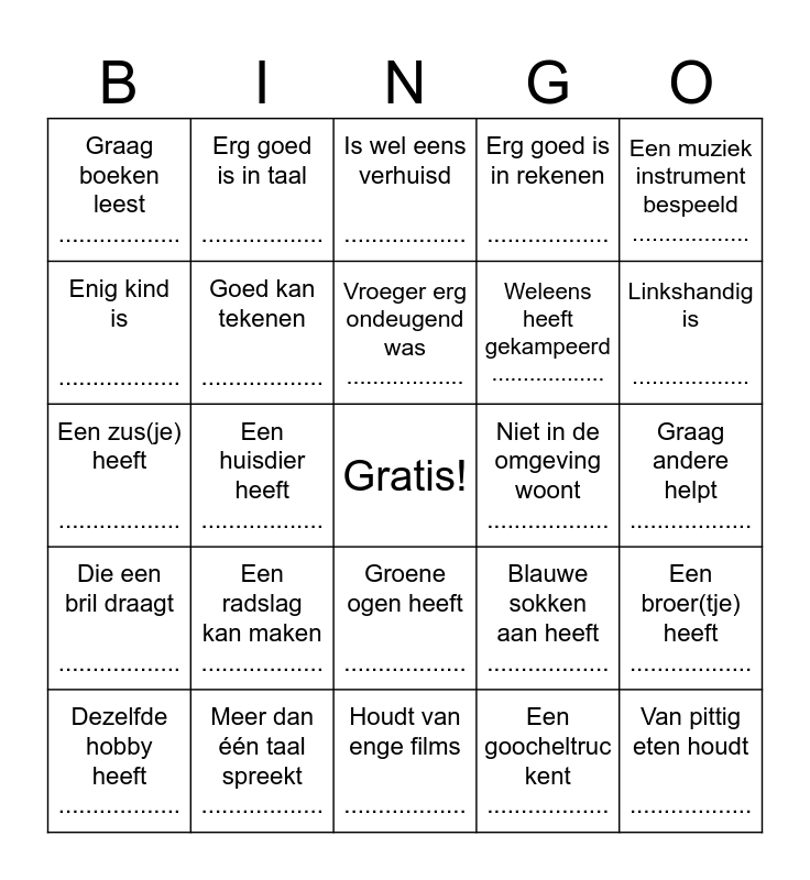This bingo card has a free space and 24 words: Dezelfde hobby heeft .................., Een radslag kan maken .................., Vroeger erg ondeugend was .................., Een goocheltruc kent .................., Een muziek instrument bespeeld .................., Graag boeken leest .................., Erg goed is in taal .................., Is wel eens verhuisd .................., Niet in de omgeving woont .................., Graag andere helpt .................., Een zus(je) heeft .................., Goed kan tekenen .................., Blauwe sokken aan heeft .................., Een broer(tje) heeft .................., Enig kind is .................., Meer dan één taal spreekt .................., Houdt van enge films .................., Erg goed is in rekenen .................., Linkshandig is .................., Die een bril draagt .................., Een huisdier heeft .................., Groene ogen heeft .................., Weleens heeft gekampeerd .................. and Van pittig eten houdt ...................