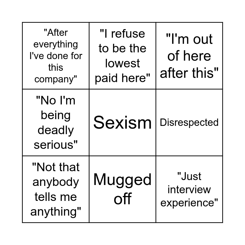 This bingo card has a free space and 8 words: Disrespected, "I'm out of here after this", "I refuse to be the lowest paid here", "Not that anybody tells me anything", "After everything I've done for this company", "Just interview experience", "No I'm being deadly serious" and Mugged off.